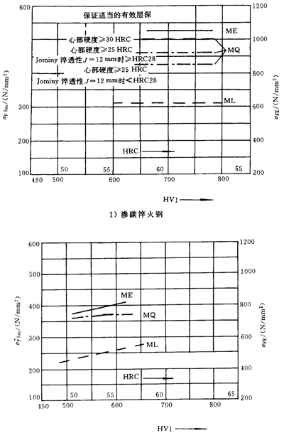 圖中硬化齒輪的疲勞極限值對滲碳齒輪適用于有效硬化層深度(加工后的)δ≥0.15mn,對于氮化齒輪,其有效硬化層深度δ=0.4~0.6mm。
