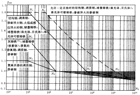 條件循環(huán)次數(shù)Nc是齒輪材料S-N(即應(yīng)力-循環(huán)次數(shù))曲線上一個特征拐點(diǎn)的循環(huán)次數(shù),并取該點(diǎn)處的壽命系數(shù)為1.0,相應(yīng)的S-N曲線上的應(yīng)力稱為疲勞極限應(yīng)力。