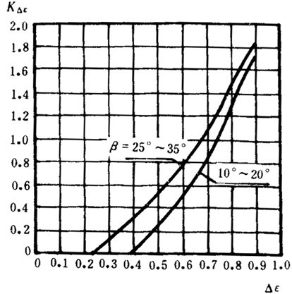 接觸跡系數(shù)是考慮重合度尾數(shù)Δε對輪齒應(yīng)力的影響系數(shù)。當(dāng)Δε較大時,在相應(yīng)于Δε的齒寬部分,即使在最不利的情況下,也有部分接觸跡參與承擔(dān)載荷,使輪齒應(yīng)力有所下降。推薦Δε=(0.25~0.4)。KΔε值可按Δε由圖3查取。當(dāng)齒端修薄時,應(yīng)根據(jù)減去齒端修薄長度后的有效齒長部分的Δε來查圖(當(dāng)20°<β°<25°時,采用插值法查。。