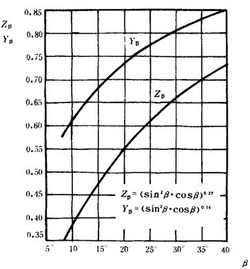 螺旋角系數(shù)是考慮螺旋角影響齒面相對曲率半徑,從面影響輪齒應(yīng)力的系數(shù)。其值可按圖5查取,或按圖中公式計算。