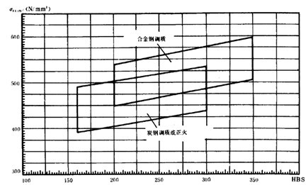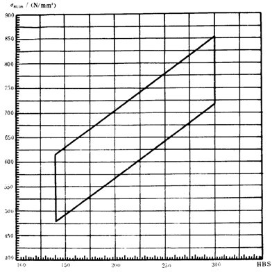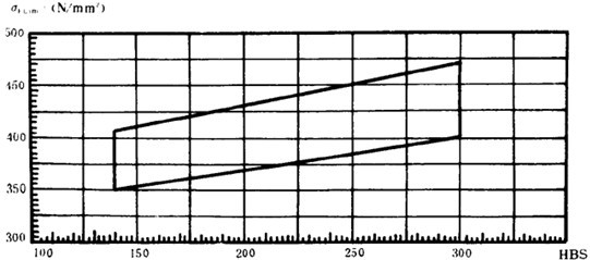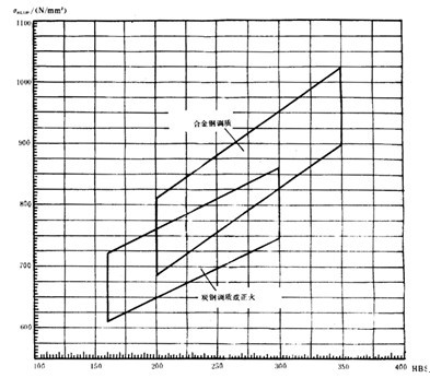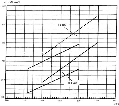 疲勞極限是指某種材料的齒輪經(jīng)長期持續(xù)的重復(fù)載荷(接觸應(yīng)力循環(huán)基數(shù)No=5×107,彎曲應(yīng)力循環(huán)基數(shù)No=3×106)作用后,輪齒保持不破壞時的極限應(yīng)力。它可由齒輪的負荷動轉(zhuǎn)試驗或經(jīng)驗統(tǒng)計數(shù)據(jù)獲得。當(dāng)缺乏資料時,可參考圖10和圖11,根據(jù)材料和齒面硬度取值。鑄鋼、氮化鋼和球墨鑄鐵的疲勞極限見附錄A(補充件)。