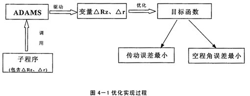 上已述及,擺線輪修形方式及修形量的選擇對RV減速器傳動誤差及空程角誤差的影響很大,因此進行優(yōu)化分析應將傳動誤差及空程角誤差作為目標函數(shù),而將移距修形量△Rz及等距修形量△r作為設(shè)計變量,且△Rz與△r的正、負號表明了修形方式,子程序又是建立擺線輪的通用齒廓方程,通過ADAMS對子程序的調(diào)用,就可得到最優(yōu)的修形組合。具體的實現(xiàn)過程如下圖所示: