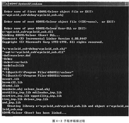 5)在背景模式(即命令提示模式)下,將上一步的目標文件與ADAMS鏈接,生成可執(zhí)行的用戶庫(*.dll)。