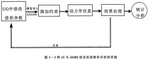 前面已經(jīng)以擺線傳輸線的參數(shù)化建模為例,闡述了UG的強大的基于特征的參數(shù)化造型功能,既然用子程序的方式實現(xiàn)不了,將UG的該功能加以充分利用,也可以實現(xiàn)優(yōu)化修形的目的。實現(xiàn)的途徑是在建造擺線輪的表達式中考慮修形量△Rz與△r,這樣就建造了修形后的擺線輪,同時△Rz與△r是隨機可調(diào)的變量,可以得到任意組合的修形方式。并且UG的數(shù)據(jù)存儲具有單一數(shù)據(jù)庫的特點,零件圖中修改后,裝配圖及工程圖全都自動更新,不用人工去費時修改。然后,再將總裝配模型導入到ADAMS中施加約束。執(zhí)行仿真。這樣就得到多組修形組合的仿真結(jié)果,經(jīng)過統(tǒng)計分析就可得到最佳的修形組合。具體思路如下圖所示。