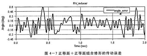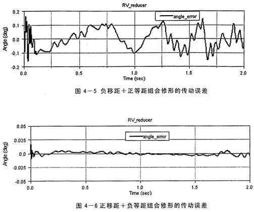 其中,θer一一角度運動誤差,一一任意時刻輸入軸轉(zhuǎn)角,i一一傳動比,θout一一輸出軸轉(zhuǎn)角。由于加工誤差、輪齒修形的原因引起瞬時傳動比的變化,必然出現(xiàn)傳動誤差,產(chǎn)生運動的不平穩(wěn)性。在RV減速器中,漸開線齒輪嚙合在前級,后級是擺線針輪傳動,由于后級的傳動比一般約是前級的4~30倍,前級的漸開線齒輪的傳動誤差將被縮小同樣的倍數(shù)后輸出,所以其傳動誤差關(guān)鍵取決于后級的擺線針輪的嚙合誤差,而實際工作中擺線輪的修形方式及修形量的選擇是影響擺線針輪的嚙合誤差很大的因素。因此本課題中僅研究了輪齒修形對傳動誤差的影響,所采用的修形量以及得到的傳動誤差大小如表4-1所示,限于篇幅,對于負移距+正等距、正移距+負等距和正移距+正等距組合修形的傳動誤差仿真結(jié)果曲線各只列出一組(圖4-5、4-6、4-7)。