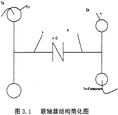 為了便于求解運(yùn)動(dòng)微分方程,需要對(duì)傳動(dòng)軸系中聯(lián)軸器的主動(dòng)和從動(dòng)兩側(cè)的轉(zhuǎn)動(dòng)慣量和剛度作力學(xué)模型的簡化。根據(jù)具體結(jié)構(gòu)情況,可以將軸系簡化為若干個(gè)等效轉(zhuǎn)動(dòng)慣量圓盤,以具有某一剛度的周聯(lián)系起來。通常比較典型的是簡化為兩個(gè)等效的圓盤,配置在聯(lián)軸器的兩側(cè)。并設(shè)定所聯(lián)兩軸的剛性很大,只有聯(lián)軸器具有彈性和阻尼。如圖3.1所示