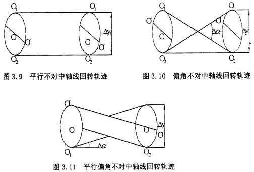 聯(lián)軸器連接的兩轉(zhuǎn)子軸線之間發(fā)生不對(duì)中故障時(shí)具有平行位移或角度位移,在運(yùn)動(dòng)傳遞過程中,聯(lián)軸器中間齒套的運(yùn)動(dòng)必須同時(shí)滿足兩半聯(lián)軸器的需要,即中間齒套軸線作平面運(yùn)動(dòng),且軸心線的回轉(zhuǎn)運(yùn)動(dòng)頻率與轉(zhuǎn)子的運(yùn)行頻率不一致。當(dāng)產(chǎn)生平行不對(duì)中、偏角不對(duì)中和平行偏角不對(duì)中三種情況時(shí),聯(lián)軸器中間齒套的軸線回轉(zhuǎn)軌跡分別為圖下圖所示的圓柱體、雙錐體和半雙錐體。在這些圖中,O1,O2為兩半聯(lián)軸器的軸心,O,O′為聯(lián)軸器中間套齒的靜態(tài)和動(dòng)態(tài)回轉(zhuǎn)中心,△y,△a分別為轉(zhuǎn)子系統(tǒng)的平行和偏角不對(duì)中量。