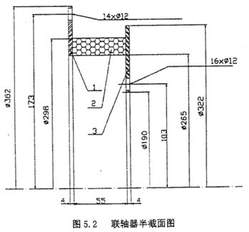 根據(jù)實(shí)際情況觀(guān)察可知橡膠塊左右分別有兩塊鋼板,析能上能下均有一些圓孔,通過(guò)實(shí)際測(cè)量得到聯(lián)軸器的基本尺寸和形狀。由于聯(lián)軸器為軸對(duì)稱(chēng)圖形,故只畫(huà)出其截面圖(圖5.2)。