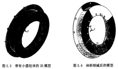 分別在鋼板的兩平面上生成系列小圓柱體,首先在每個(gè)面上通過(guò)拉伸生成一個(gè)小圓柱體,然后通過(guò)復(fù)制命令在極坐標(biāo)下分別在大圓面上生成12個(gè)小圓柱體,在小圓面上生成16個(gè)小圓柱體。結(jié)果如圖5.5所示