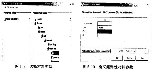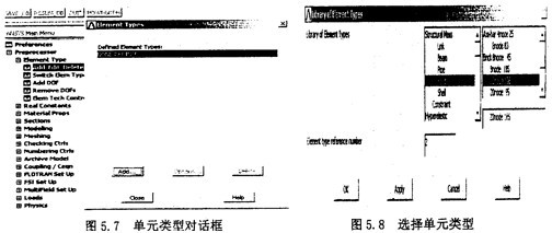 考慮到分析橡膠材料所能用到的單元,選擇Main Menu>Preprocessor>Element type>Add/Edit/Delete,在出現(xiàn)的對(duì)話(huà)框中,單擊“Add”,如圖5.7所示。這時(shí)又出現(xiàn)一個(gè)“Library of Element Type”對(duì)話(huà)框,在左面的列表欄中選擇“Structural Solid”,在其右面的列表欄中選擇“2Onode186”,單擊0K按鈕,如圖5.8。再在單元對(duì)話(huà)框中單擊Close按鈕關(guān)閉對(duì)話(huà)框。