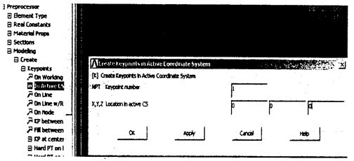 選擇Main Menu>Preprocesor>Modeling>Create>Keypoints>In Active CS,在彈出的對(duì)話(huà)框中輸入1關(guān)鍵點(diǎn)的坐標(biāo),如圖5.11所示。單擊“Apply”輸入下一個(gè)點(diǎn)的坐標(biāo)直至所有關(guān)鍵點(diǎn)完全輸入。6個(gè)關(guān)鍵點(diǎn)的坐標(biāo)如表5.1所示。