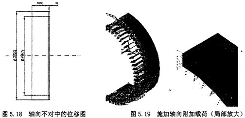 軸向不對(duì)中時(shí),根據(jù)實(shí)際情況取中量為△ax=5mm,則可以認(rèn)為外端面沿z軸方向的位移為5mm,如圖5.18所示。產(chǎn)生的附加的軸向載荷按照。選擇選擇Main Menu>>Solution>Define Loads>Apply>Structural>Force>Moment>On Nodes命令,選擇圓環(huán)外端面上所有的節(jié)點(diǎn),在出現(xiàn)的對(duì)話(huà)框中選擇比,并在輸入value文本框中輸入39。加載后的結(jié)果如5.19所示。旁邊為局部放大圖。