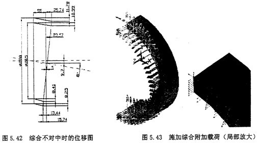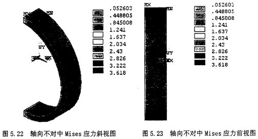 重復(fù)5.4.2節(jié)中的(1),(2),(3),(4),(5),(6)步驟。然后開(kāi)始施加綜合的附加載荷。由于綜合位移使得橡膠圓環(huán)附加的徑向拉應(yīng)力σax,附加的剪應(yīng)力τrad,附加的角向應(yīng)力σax,以及由橡膠圓環(huán)旋轉(zhuǎn)扭矩產(chǎn)生的剪應(yīng)力τrot。所以綜合不對(duì)中的應(yīng)力情況應(yīng)該是σax、σax、σax與σrot的疊加。施加綜合附加載荷后的圖形圖5.43所示。