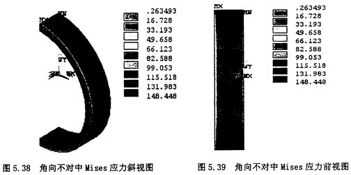 2.顯示節(jié)點(diǎn)的Von Mises應(yīng)力云圖:選擇Main Menu>General Postproc>Plot Result>NodalSolu,在彈出的對(duì)話(huà)框內(nèi)選擇“Stress”,第二欄內(nèi)選擇“Von Mises Stress”,則其顯示的云圖如圖5,38,5.39所示