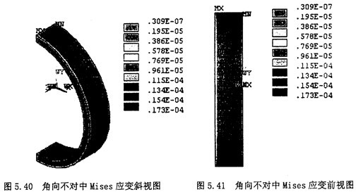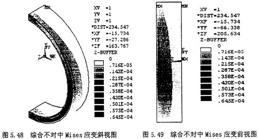 3.顯示節(jié)點(diǎn)的Von Mises應(yīng)變?cè)茍D:選擇Main Menu>General Postproc>Plot Result>NodalSolu,在彈出的對(duì)話(huà)框內(nèi)選擇“Strain”,第二欄內(nèi)選擇“Von Mises Strain”,則其顯示的云圖如圖5.48,5.49所示