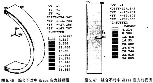 2.顯示節(jié)點(diǎn)的Von Mises應(yīng)力云圖:選擇Main Menu>General Postproc>Plot Result>NodalSolu,在彈出的對(duì)話(huà)框內(nèi)選擇“Stress”,第二欄內(nèi)選擇“Von Mises Stress”,則其顯示的云圖如圖5.46,5.47所示