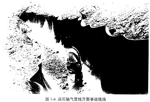 圖1-4為高壓輸氣管線開裂事故現(xiàn)場。