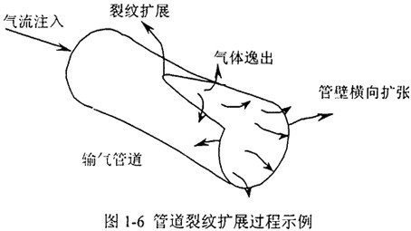本文研究的重點(diǎn)將集中于如圖1-6的貯氣輸氣管線縱向裂紋擴(kuò)展問題。針對這一問題,20世紀(jì)80年代末美國西南研究院(Southwest Research Institute,Texas)的M.F.Kanninen,O'Donoghue等人提出了輸氣管道縱向裂紋擴(kuò)展問題的計(jì)算模型,將裂紋擴(kuò)展的斷裂動(dòng)力學(xué)算法同殼體有限元組合起來,發(fā)展了模擬計(jì)算程序PFRAC(Pipeline FRacture Analysis Code)。莊茁改進(jìn)了其部分功能并擴(kuò)展了組合受力分析的能力,發(fā)展了開裂結(jié)鉤與流體的解耦分析計(jì)算,并完成了解耦部分的計(jì)算程序。通過與實(shí)驗(yàn)比較,該程序的可靠性得到了證實(shí)。