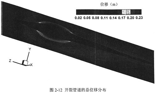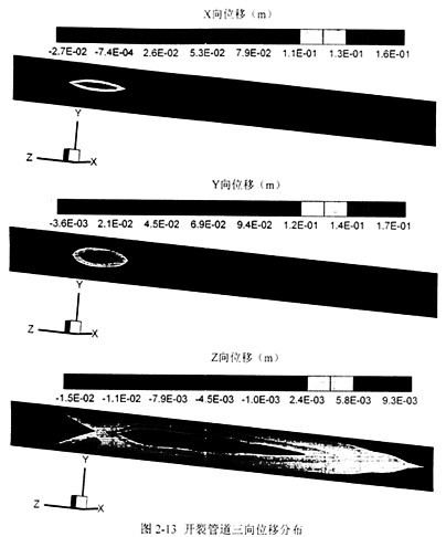 圖2-13分別按照三個(gè)方向上的位移分布在開裂前管道表面畫出云紋圖。從圖中可以看到,此種設(shè)計(jì)參數(shù)下的位移量主要發(fā)生在裂尖附近5m左右的區(qū)域,對(duì)遠(yuǎn)端的影響較小。
