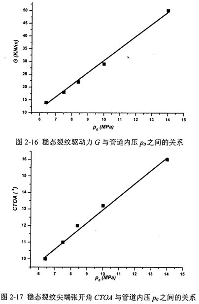 目前我國(guó)輸氣管道的最高輸氣壓力為6.4MPa;俄羅斯運(yùn)營(yíng)的輸氣干線最高為7.5MPa;西氣東輸工程先期設(shè)計(jì)壓力8.4MPa;干線設(shè)計(jì)壓力10MPa;國(guó)際上的輸送壓力在二十世紀(jì)末期達(dá)到了14MPa。圖2-16和2-17給出了上述幾種壓力下計(jì)算的動(dòng)態(tài)能量釋放率G和裂紋尖端張開角CTOA的值,管道口徑和壁厚均分別為1.016m和14.7mm。從圖上看,G和CTOA與PO呈線性關(guān)系。