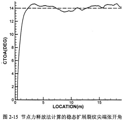 圖2-9表示了CTKOA的計(jì)算方法。由于在裂紋后方有很大的非線性變形,計(jì)算中張開位移用割線近似,采用8個(gè)單元的長(zhǎng)度來(lái)計(jì)算CTOA。這一長(zhǎng)度經(jīng)過(guò)與細(xì)化后的網(wǎng)格結(jié)果比較,誤差在10%之內(nèi)。