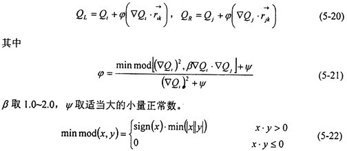 但是,由(5-18)直接得到的格式在激波附近是不穩(wěn)定的,將會出現(xiàn)非物理振蕩。迎風(fēng)格式通過限制物理量的梯度值,來保證物理量在單元內(nèi)的分布具有單調(diào)性,從而達(dá)到抑制間斷附近非物理振蕩的目的。這時,(5-18)式變?yōu)?/DIV>