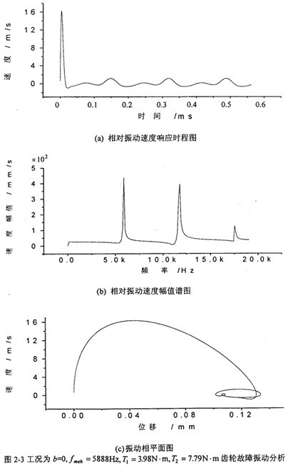 圖2-3是工況為:齒輪嚙合頻率為5888Hz、齒側(cè)間隙b=0齒輪故障振動(dòng)分析,其中(a)圖為齒輪輪齒相對(duì)振動(dòng)速度時(shí)程響應(yīng)圖,(b)圖為齒輪輪齒相對(duì)振動(dòng)速度幅值譜圖。從圖上可看出,當(dāng)齒側(cè)間隙為0時(shí),此時(shí)振動(dòng)故障頻率為齒輪嚙合頻率fmeh。的1、2、3倍。相平面圖也穩(wěn)定于一個(gè)橢園極限環(huán)(見(c)圖)。