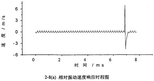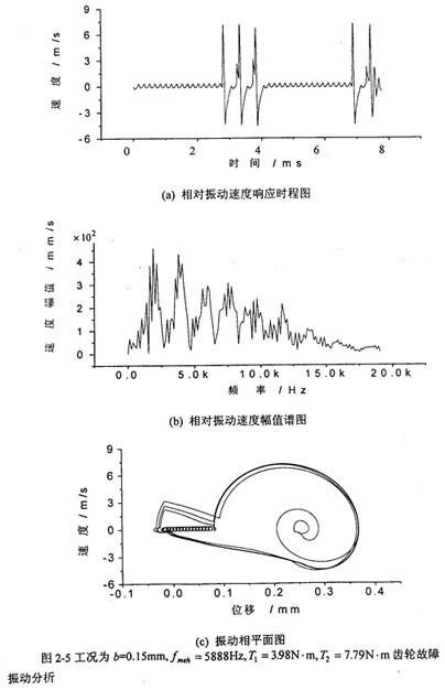軸承對(duì)箱體動(dòng)態(tài)激勵(lì)力和齒傳輸線相對(duì)振動(dòng)位移X=(rb1tgθ1-rb2tgθ2)有相對(duì)振動(dòng)速度 (=rb1sec2θ1 1)有關(guān),文中只列出 的計(jì)算結(jié)果,圖2-3~圖2-13為各種工況的齒輪故障振動(dòng)分析,其中包括齒輪輪齒相對(duì)振動(dòng)速度時(shí)程響應(yīng)圖、齒輪輪齒相對(duì)振動(dòng)速度幅值譜圖和相平面圖。