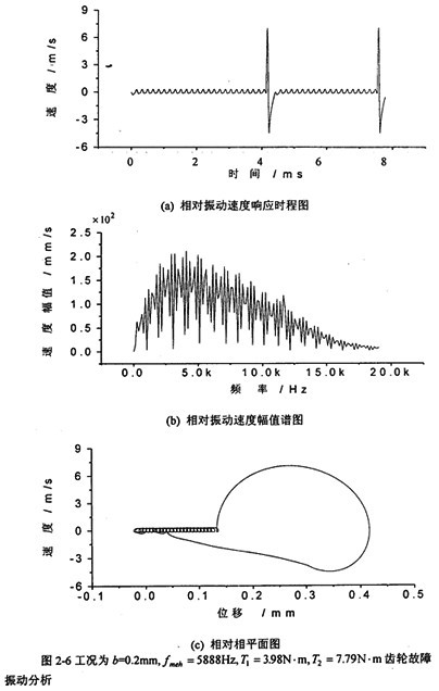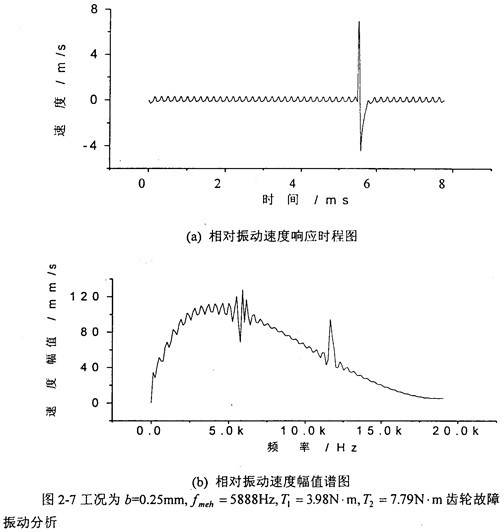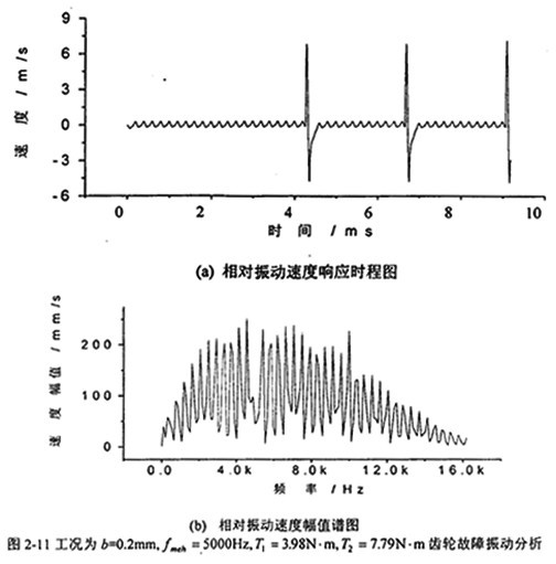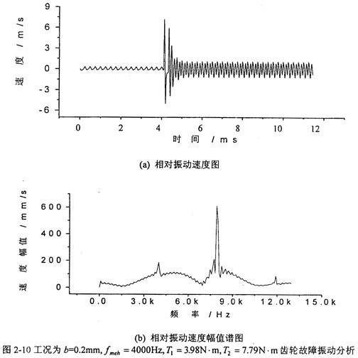 圖2-10中,(a)圖和(b)圖分別是當(dāng)齒輪嚙合頻率增加到4000Hz、齒側(cè)間隙增加到b=0.2mm時(shí)齒輪輪齒相對(duì)振動(dòng)速度時(shí)程響應(yīng)圖和齒輪輪齒相對(duì)振動(dòng)速度幅值譜圖。從(b)圖上可看出,此時(shí)振動(dòng)故障頻率仍為齒輪嚙合頻率fmeh的1、2、3倍,分?jǐn)?shù)諧波也不明顯,但2fmeh的幅值比1fmeh的大。