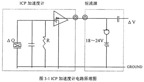 典型的集成壓電式(ICP)加速度計是在傳統(tǒng)的壓電加速度計基礎(chǔ)上耦合一個以場效應(yīng)管為核心的內(nèi)裝放大器電路所構(gòu)成。電路原理如圖3-1所示。ICP加速度計除了能帶來使用方便操作簡化的優(yōu)越性外,較傳統(tǒng)的壓電加速度計還具有如下一系列的優(yōu)點(diǎn):