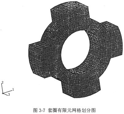 套圈是一個不規(guī)則的零件,先用有限元按三維八節(jié)點(diǎn)實體單元對它進(jìn)行網(wǎng)格劃分,圖3-7是有限元網(wǎng)格劃分圖。邊界條件是這樣處理的:由于套圈裝在減速機(jī)箱體孔中時,和孔的配合是過盈配合,且套圈內(nèi)表面與傳動軸外表面也是過盈配合,故套圈的配合面處均按固支對待。經(jīng)ABAQUS有限元軟件處理后輸出質(zhì)量矩陣和剛度矩陣,然后用廣義的Collatz包含定理求出它的低階固有頻率。