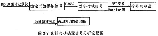 圖3-8是齒輪傳動裝置信號分析流程圖,用HP3562動態(tài)數(shù)字分析儀采集MR-30磁帶記錄儀紀(jì)錄的二級圓柱斜齒輪減速機(jī)試驗過程中的模擬信號,可得到齒輪傳動裝置載荷、齒輪傳動裝置箱體動態(tài)激勵力應(yīng)變變化的時域信號,對此信號作FFT變換,可得到載荷譜和動態(tài)激勵力應(yīng)變變化時域信號的功率譜。為了防止功率譜泄露,在作FFT變換時,需作加窗處理,由于試驗采集的是隨機(jī)信號,故加漢寧(Hanning)窗處理。利用故障診斷特征參數(shù)一傳動零件可能發(fā)生故障的振動頻率及其振動頻率處的功率對試驗信號進(jìn)行診斷分析。當(dāng)功率譜所包含的頻率成份難以區(qū)分時,可采用倒譜分析。