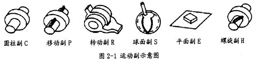 在等角速萬向聯(lián)軸器中,大部分都屬于連桿機(jī)構(gòu).最古老的雙聯(lián)十字軸萬向聯(lián)軸器機(jī)構(gòu)就是球面四連桿機(jī)構(gòu)。從大量的不同的機(jī)構(gòu)綜合中,有可能得出多種實(shí)用的等角速連桿機(jī)構(gòu),所以研究等角速理論,以連桿機(jī)構(gòu)的型式和尺度關(guān)系為對象,進(jìn)行新的等角速理論的探索,在一定的意義上是可行的。在機(jī)構(gòu)學(xué)上,構(gòu)件同構(gòu)件間的連接稱為副,其不同的形式和代號如圖2-1所示: