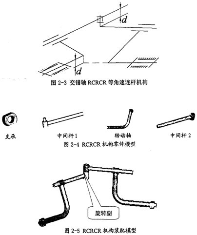 通過上述的方法,可以得到相交軸、交錯軸形式的多種等角速連桿機(jī)構(gòu)。在圖2-2中列出了其中的一部分,它們都是相交軸傳動的形式,當(dāng)然全都是鏡面機(jī)構(gòu)。在這些機(jī)構(gòu)中有的已被應(yīng)用在等角速聯(lián)軸器上,如球鉸柱塞式萬向聯(lián)軸器就是以RPSPR機(jī)構(gòu)為基礎(chǔ)。在圖2-3中列出了其中的一種較重要的交錯軸形式的等角速連桿機(jī)構(gòu)。