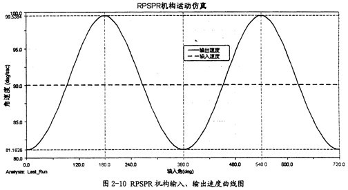 在此仿真中共輸出了此模型運(yùn)動兩周的曲線,這證明此模型中雙曲柄肯定存在,按前面的理論,如果機(jī)構(gòu)是鏡面機(jī)構(gòu),在輸入轉(zhuǎn)速恒定的情況下,則輸出轉(zhuǎn)速就是恒定的,在圖2-10中,在輸入轉(zhuǎn)速恒定為90°/s時,其輸出轉(zhuǎn)速是周期變化的。后來經(jīng)模型修改,將原模型改為完全對稱結(jié)構(gòu),滿足鏡面機(jī)構(gòu)的條件,重新進(jìn)行仿真,得出的結(jié)果是輸入轉(zhuǎn)速同輸出轉(zhuǎn)速完全相等。這從正反兩面說明了前面理論的正確性,同時也說明要想得到等角速傳動并不是一件簡單的事。不過本次證明只是對一種形式機(jī)構(gòu)而言,有關(guān)其它的機(jī)構(gòu)形式,還需要進(jìn)一步的探索。