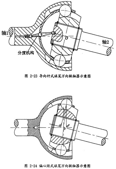 球籠式萬向聯(lián)軸器是目前性能最優(yōu)良,應(yīng)用最廣泛的一種等角速萬向聯(lián)軸器,根據(jù)結(jié)構(gòu)形式的不同可分為兩大類,即導(dǎo)向桿式球籠萬向聯(lián)軸器和偏心距式球籠萬向聯(lián)軸器,分別如圖2-23和圖2-24所示。