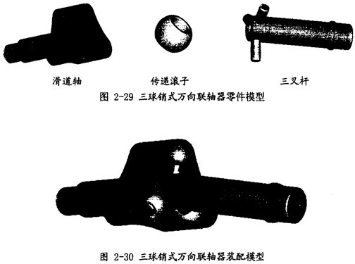 三球銷式萬向聯(lián)軸器是一種被廣泛應(yīng)用的聯(lián)軸器,已有近30年的歷史,它同后面敘述的兩種聯(lián)軸器同屬三叉式萬向聯(lián)軸器,它們的傳動原理在本文的第三章中有詳細(xì)的描述,是一種運(yùn)動規(guī)律十分復(fù)雜的聯(lián)軸器。它的裝配模型和零部件模型分別如圖2-30、圖2-29所示.在聯(lián)軸器轉(zhuǎn)動時,傳遞滾子既可相對滑道軸中的滑道軸向移動,也可沿三叉桿的軸頸轉(zhuǎn)動和徑向移動,以補(bǔ)償兩軸夾角的變化。