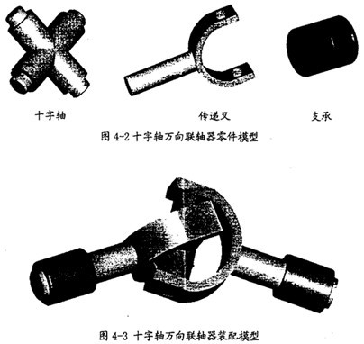 當(dāng)前,在工程領(lǐng)域,應(yīng)用美國PTC公司的CAD軟件Pro/E和美國MDI公司的動(dòng)力學(xué)仿真軟件ADAMS聯(lián)合進(jìn)行復(fù)雜機(jī)械系統(tǒng)的動(dòng)力學(xué)仿真研究是一種較實(shí)用、較流行的仿真方案。本文的仿真分析中所有模型均是采用這種方案?紤]到建模的注意因素,在用Pro/E建模的過程中,省去了十字軸萬向聯(lián)軸器的許多細(xì)小結(jié)構(gòu),如潤滑部分、滾針軸承、彈簧卡圈等,只是保留了十字軸萬向聯(lián)軸器在原理上進(jìn)行傳動(dòng)的必需構(gòu)件和運(yùn)動(dòng)副。在此原則下建立的十字軸萬向聯(lián)軸器的各構(gòu)件模型如圖4-2所示,實(shí)際上只包含十字軸和傳遞叉兩個(gè)活動(dòng)構(gòu)件。建立的十字軸萬向聯(lián)軸器的裝配模型如圖4-3所示。