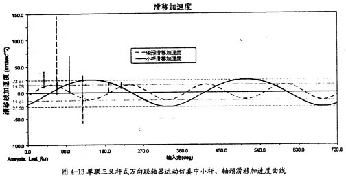 由圖4-13可以知道,在一定的夾角下,小桿在滑道中有滑移加速度同小桿球面中心相對(duì)軸頸的滑移加速度是不同的,前者要大于后者,且它們變動(dòng)的頻率也不一樣,在一個(gè)回轉(zhuǎn)周期中前頻率是1次,而后者2次。此圖中的兩曲線同第三章中的理論分析曲線圖3-13、圖3-14是吻合的,只是小桿滑移的加速度曲線在外形上有差異,仿真的曲線相當(dāng)?shù)钠交、?guī)則,但理論分析曲線卻不規(guī)則,這可能是在計(jì)算中簡化和省略的原因。盡管如下,這在一定的程度上也證明了三叉桿式萬向聯(lián)軸器理論分析中對(duì)小桿滑移加速度和軸頸滑移加速度這兩項(xiàng)計(jì)算的正確性。(值得說明的是此圖中曲線有時(shí)有突變的現(xiàn)象,主要是考慮到計(jì)算機(jī)的性能,計(jì)算中步長稍大的原故。在后面的分析曲線中也出現(xiàn)了這樣的情況,將不再作說明。)
