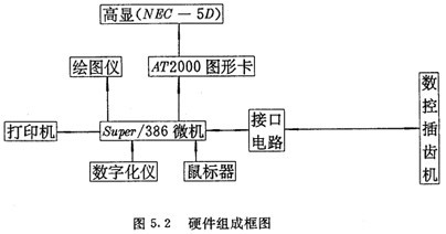 本系統(tǒng)是在一臺微型計算機(jī)super/386基礎(chǔ)上,增加一塊選進(jìn)的圖形卡,一臺高分辨率顯示器,數(shù)控接口電路及相應(yīng)設(shè)備,組成了一個微機(jī)工作站,如圖5.2所示。