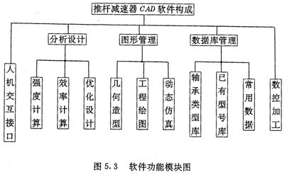 軟件主要由分析設(shè)計、圖形管理、數(shù)據(jù)庫管理及摟控加工四大部分組成,并提供了一個友好的人機(jī)交互接口界面用于實現(xiàn)漢字人機(jī)對話。本交互接口由三級推拉彈出式菜單組成。軟件模塊結(jié)構(gòu)如圖5.3所示。各大模塊的主要功能及特點如下: