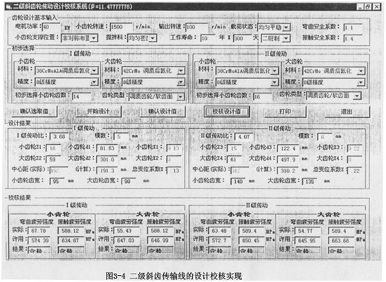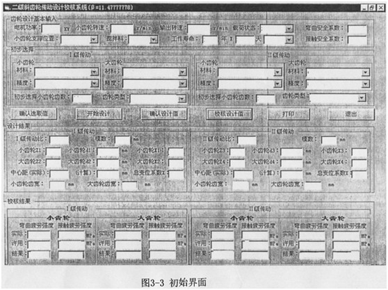 c、輪齒疲勞強度及其修正系數(shù)(ZNT、YNT、ZL、Zv、ZR、Zx、Yx、Yδreit、YRreIT)在這三類參數(shù)中,用戶參數(shù)是要由用戶給定,齒輪特性參數(shù)是要得到的結(jié)果,齒輪設計參數(shù)是一種中間描述參數(shù),它需要通過一系列的復雜的計算求解,而齒輪設計的科學性也就是通過對齒輪設計參數(shù)的精確確定而實現(xiàn)的,具體計算機實現(xiàn)公式見3.6-3.8;齒輪的接觸強度與彎曲強度校核分別見3.3和3.4。系統(tǒng)的參數(shù)初始輸入界面見圖3-3。