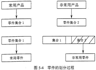劃分常用零件與非常用零件的依據(jù)是:詳細(xì)劃分各種系列產(chǎn)品中對(duì)應(yīng)的零件,分為常用要求和非常用要求二種狀態(tài),常用要求下對(duì)應(yīng)下的零件集合為常用零件:非常用要求下對(duì)應(yīng)下的零件集合,減去常用零件集合為非常用零件,即扣除常用零件便得非常用零件。具體過(guò)程見(jiàn)圖5-4。