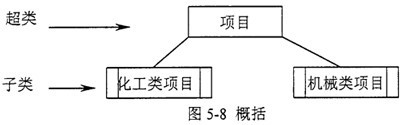 3、概括(Generalization):定義類型之間的一種子集聯(lián)系。它抽象了類型之間的“is ubset of”的語(yǔ)義。例如項(xiàng)目是個(gè)實(shí)體型,機(jī)械類項(xiàng)目也是實(shí)體型,化工類項(xiàng)目也是實(shí)體型。機(jī)械類項(xiàng)目、化工類項(xiàng)目均是項(xiàng)目的子集。我們把項(xiàng)目稱為超類(Superclass),將機(jī)械類項(xiàng)目、化工類項(xiàng)目成為項(xiàng)目的子類(Subclass),見(jiàn)圖5-8。