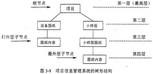 對(duì)于項(xiàng)目信息管理系統(tǒng),有自己的特殊性,從邏輯結(jié)構(gòu)上說(shuō),他是一個(gè)典型的樹(shù)型結(jié)構(gòu),每個(gè)節(jié)點(diǎn)除根節(jié)點(diǎn)外,有自己的子節(jié)點(diǎn);每個(gè)節(jié)點(diǎn)除最外層子節(jié)點(diǎn)外,有自己的父節(jié)點(diǎn)。在本系統(tǒng)中,項(xiàng)目是整個(gè)樹(shù)結(jié)構(gòu)的根節(jié)點(diǎn),而個(gè)圖紙內(nèi)容是最外層子節(jié)點(diǎn),項(xiàng)目是設(shè)備圖紙和小樣圖的父節(jié)點(diǎn),圖紙、小樣圖又是圖紙內(nèi)容的父節(jié)點(diǎn),見(jiàn)圖5-9。