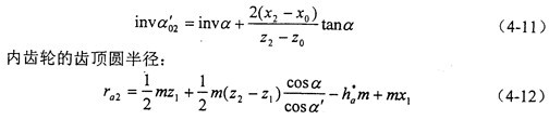 變位系數(shù)的確定是少齒差內(nèi)嚙合傳動(dòng)設(shè)計(jì)的關(guān)鍵。文獻(xiàn)中所述的內(nèi)、外齒輪都按滾齒加工的計(jì)算公式推導(dǎo)出的變位系數(shù)的迭代公式,與內(nèi)齒輪插齒、外齒輪滾齒的實(shí)際加工情況不一致,雖然能夠保證給定的重合度和齒廓不重迭干涉系數(shù)的要求,但是不能保證標(biāo)準(zhǔn)頂隙,而且一般得出的嚙合角也比較大。本章推導(dǎo)了少齒差內(nèi)嚙合傳動(dòng)實(shí)際加工情況的變位系數(shù)的迭代公式,解決了上述問題。