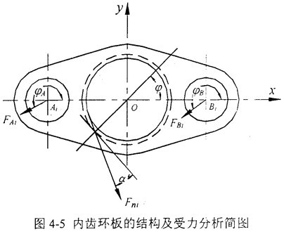 也就是說:當(dāng)一個(gè)內(nèi)齒環(huán)板與外齒輪在某一位置嚙合時(shí),另一塊環(huán)板與外齒輪各自節(jié)圓之對(duì)滾弧長(zhǎng)差為節(jié)圓齒距,相對(duì)相位差角為內(nèi)齒輪一個(gè)齒所對(duì)應(yīng)的圓心角,此時(shí)另一塊環(huán)板在該位置剛好能夠裝入。換句話說,對(duì)于本文的三環(huán)減速機(jī),按照4.3的制造工藝,就可以將三片內(nèi)齒環(huán)板均布地安裝在兩根高速偏心輸入軸上,并且保證它們之間的瞬時(shí)相位差呈180°角。