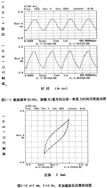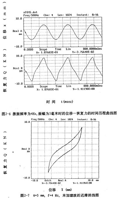 信號處理時,將磁帶記錄儀記錄的五路振動信號經(jīng)磁帶記錄儀回放,愉出到數(shù)據(jù)采集板(A/D板)進(jìn)行五路振動信號(恢復(fù)力、位移、速度、加速度信號)同步采樣和A/D轉(zhuǎn)換,然后輸出到PC386微機(jī)存人磁盤,該數(shù)據(jù)采集系統(tǒng)采集的數(shù)據(jù)都是以二進(jìn)制形式存儲的文件。為了計算和閱讀方便,需將二進(jìn)制數(shù)據(jù)文件轉(zhuǎn)換成ASC碼文件,然后再編程進(jìn)行數(shù)據(jù)處理.對處理后形成的數(shù)據(jù)文件進(jìn)行作圖可以形成許多相應(yīng)的曲線圖,圖2-6至圖2-13是眾多曲線中的一部分。
