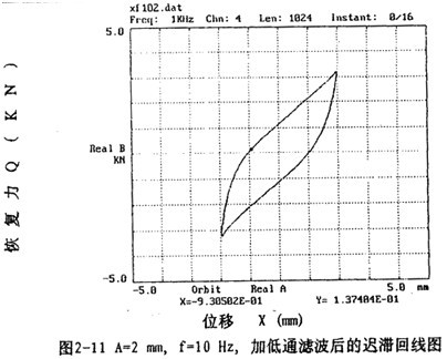 圖2-6表示激振頻率為4Hz,振動位移幅值為±5毫米的位移和恢復(fù)力的時間歷程曲線圖,由圖可知,位移時間歷程為正弦波形,對應(yīng)的恢復(fù)力時間歷程為近似的鋸齒波形。以位移為橫坐標(biāo),恢復(fù)力為縱坐標(biāo),圖2-6對應(yīng)的位移恢復(fù)力圖為圖2-7,由此圖可知彈性聯(lián)軸器具有非線性遲滯特性。在動態(tài)情況下,由于機(jī)座的高頻振動和環(huán)境干擾等因素,試驗(yàn)記錄的信號中有高頻成分存在,這使得遲滯回線不光滑,加低通數(shù)字濾波后可得光滑的遲滯回線,如圖2-8所示。