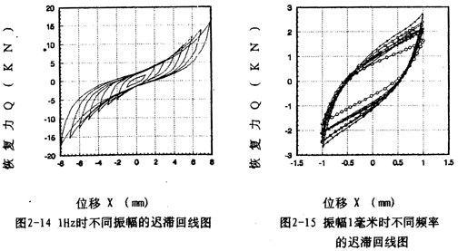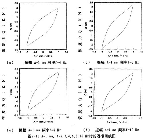 圖2-9(見26頁)表示激振頻率為1OHz,振動位移幅值為±2毫米的位移和恢復(fù)力時間歷程圖,圖2-10(見26頁)、圖2-11(見27頁)為對應(yīng)的遲滯回線圖。圖2-l2(見27、28頁)表示激振頻率為IHz,振動位移幅值分別為±(1-8)毫米的位移一恢復(fù)力圖,圖2-14(見29頁)則為圖2-12的合圖,由圖2-14同頻率不同振幅的八條遲滯回線分析可知,大撓度剛絲繩彈性聯(lián)軸器的動剛度與振動幅值有關(guān),同時,從遲滯回線面積(表示聯(lián)軸器阻尼所耗散的能量)可知聯(lián)軸器的阻尼與振動幅值也有關(guān),即聯(lián)軸器的動剛度和阻尼均是振幅的非線性函數(shù)。